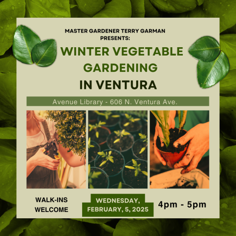 Learn how to enjoy an endless supply of fresh, nutritious greens from your own garden with our "Year-Round Leafy Bounty" class. In this tips-filled session, you'll learn when to plant various greens suited for the local Ventura climate, season extension methods, soil preparation, growing tips, what to do about common disease and pests, and harvesting tips for continual production.