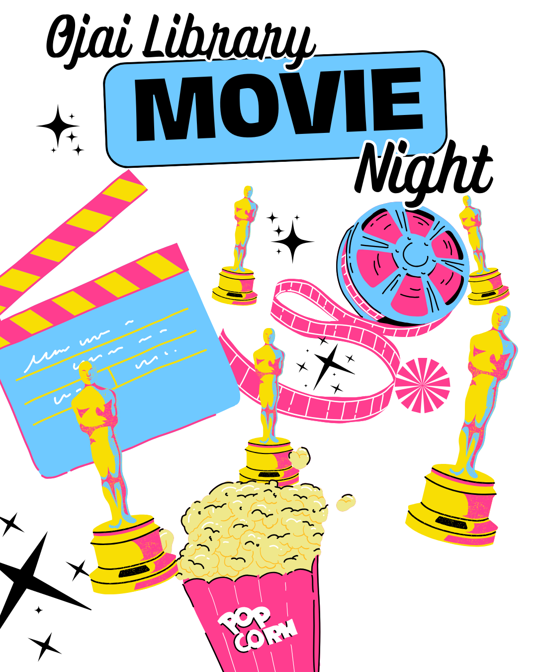 Ojai Library Movie Night. Colorful cinema themed illustrations.
